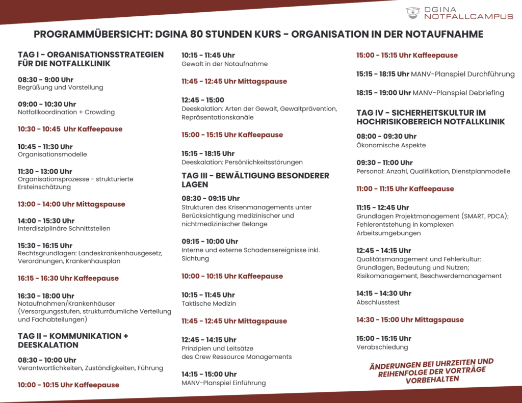 Der Kurs vermittelt die Inhalte der strukturierten curricularen Fortbildung der Bundesärztekammer „Organisation in der Notaufnahme“. Die Inhalte wurden gemeinsam von DIVI und DGINA für die Zusatzweiterbildung Klinische Akut- und Notfallmedizin entwickelt und bilden die dort beschriebenen Kenntnisse in Organisation und Management der klinischen Notfallmedizin ab.