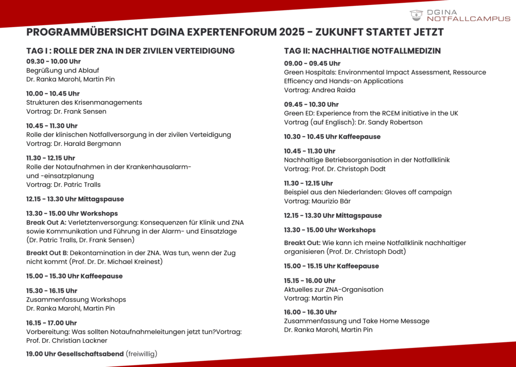 Das DGINA Expertenforum ist der Treffpunkt des Notaufnahme-Managements: Moderiert von einer erfahrenen Stamm-Faculty werden im Plenum die wichtigsten Themen der Notaufnahmeführung über kompakte Impulsvorträge umrissen. Anschließend geht es in Kleingruppen-Workshops um die interaktive Diskussion und die konkrete Gestaltung im Detail. Über eine Ted-Abstimmung können die Teilnehmenden eigene inhaltliche Impulse setzen.