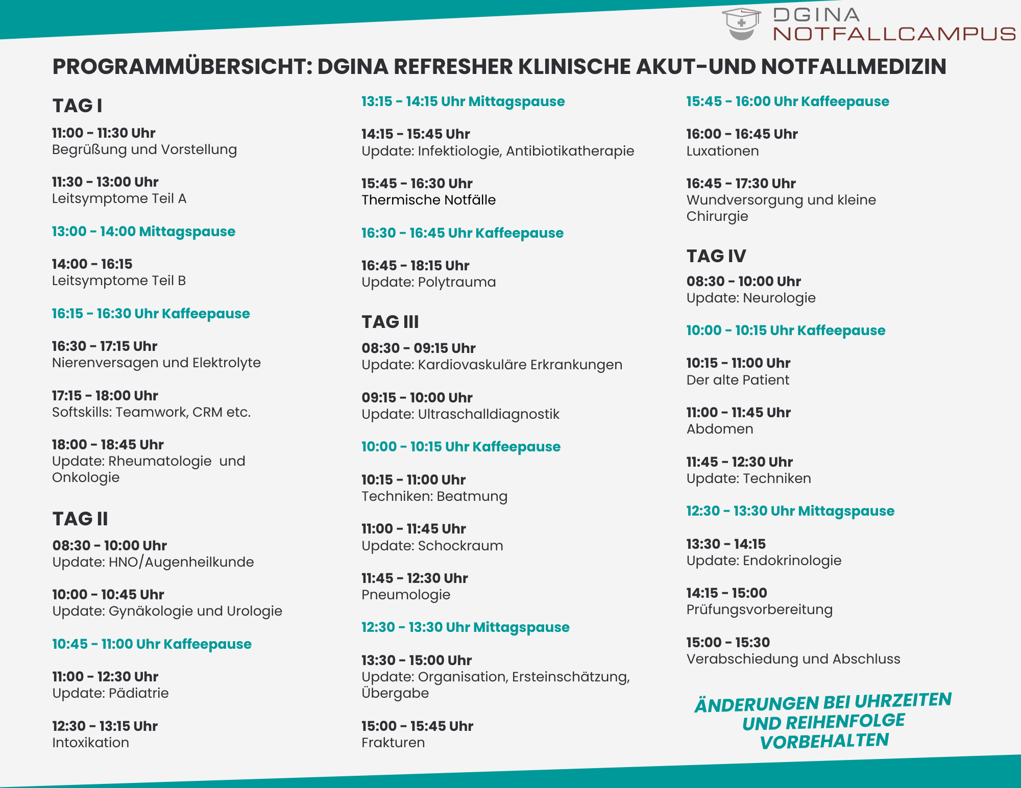 Der Kompaktkurs gibt an vier Tagen ein strukturiertes und praxisorientiertes Update zum State of the Art der klinischen Notfallmedizin. Unsere ReferentInnen sind Top-Level-ExpertInnen in ihrem Fachbereich mit langjähriger Erfahrung in der Notfallmedizin.