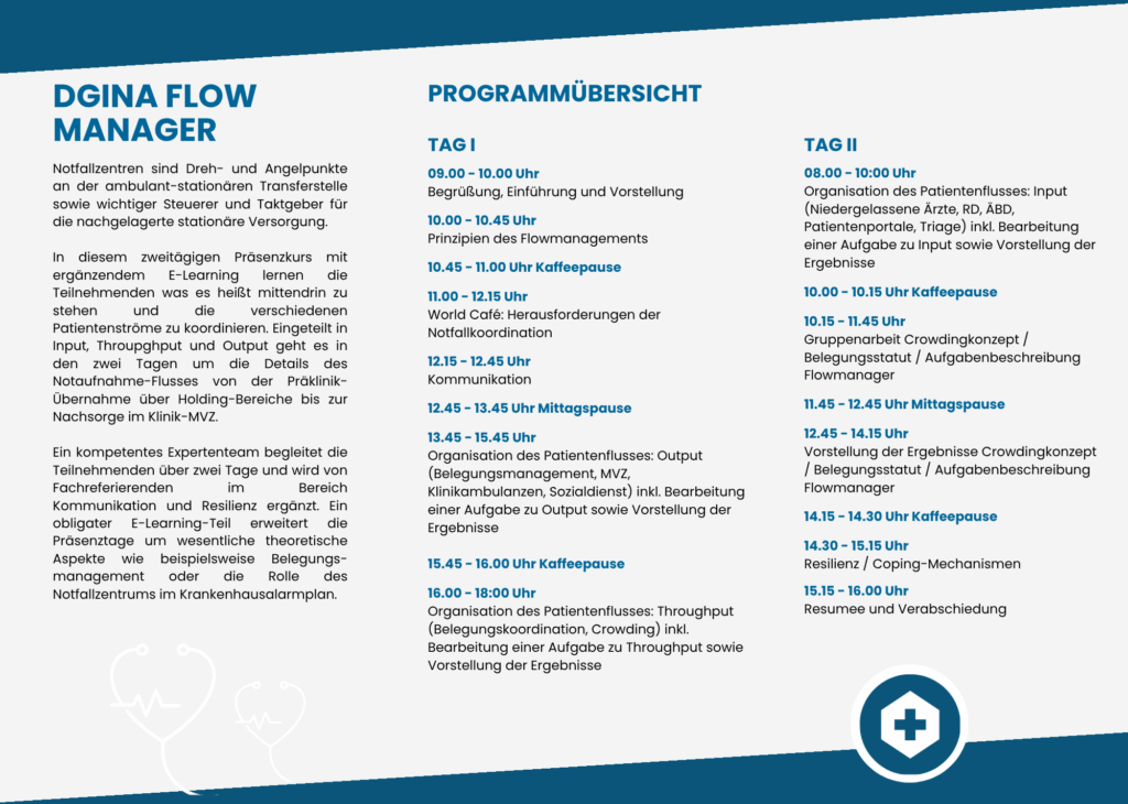 Notfallzentren sind Dreh- und Angelpunkte an der ambulant-stationären Transferstelle sowie wichtiger Steuerer und Taktgeber für die nachgelagerte stationäre Versorgung. In diesem zwei-tägigen Präsenzkurs mit ergänzendem E-Learning lernen die Teilnehmenden was es heißt mittendrin zu stehen und die verschiedenen Patientenströme zu koordinieren. Eingeteilt in Input, Throupghput und Output geht es in den zwei Tagen um die Details des Notaufnahme-Flusses von der Präklinik-Übernahme über Holding-Bereiche bis zur Nachsorge im Klinik-MVZ.